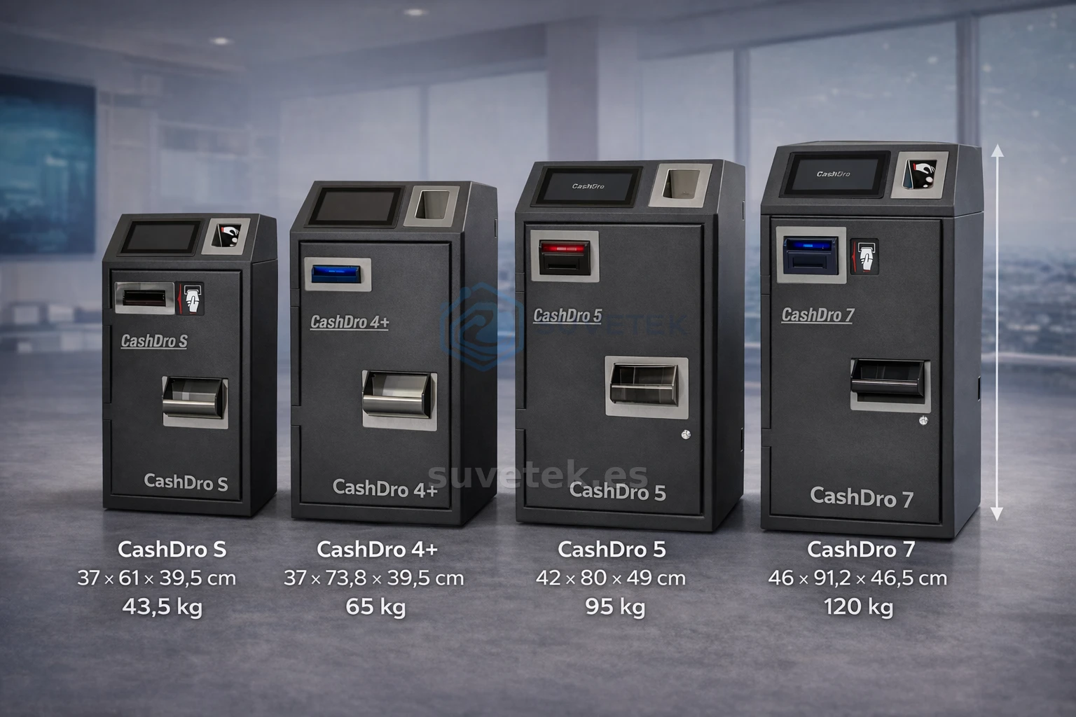 Comparamos los modelos CashDro S, CashDro 4+, CashDro 5 y CashDro 7 para ayudarte a decidir según tu volumen de efectivo,velocidad de servicio y tipo de comercio.